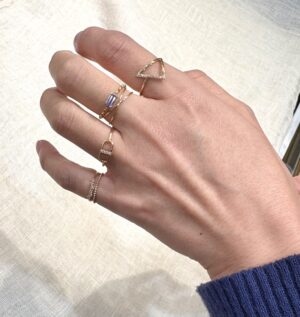 丸型(画像 薬指)はお持ちのリングと重ね付けでコーデがしやすいデザインになっております(^^♪