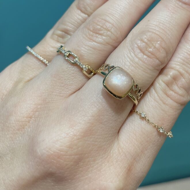 中指:K10YG地金リング¥14,850/K10YGオレンジムーンストーン カボションリング¥34,650