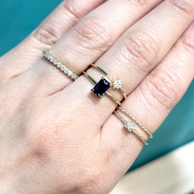 中指:K10YGスターダストダイヤリング¥23,650/K10YGアイオライトリング¥27,500